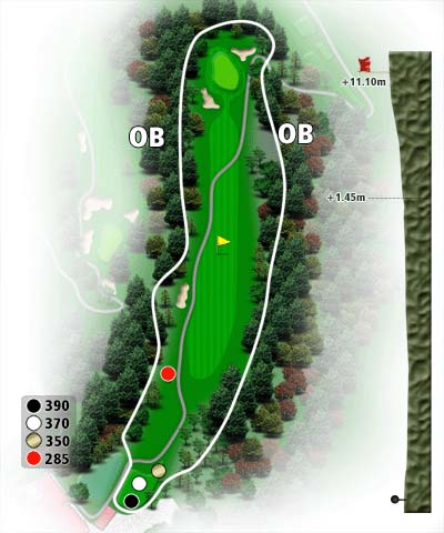 ティーグラウンド前の谷には赤い橋が架かっており、更に排水升のある残り150ヤード付近の場所にも二つ目の谷がありました。谷越えを狙ってロングドライブのティーショットを打つか、谷の手間に刻んでいくかという二つの選択肢がある戦略的なホールでした。